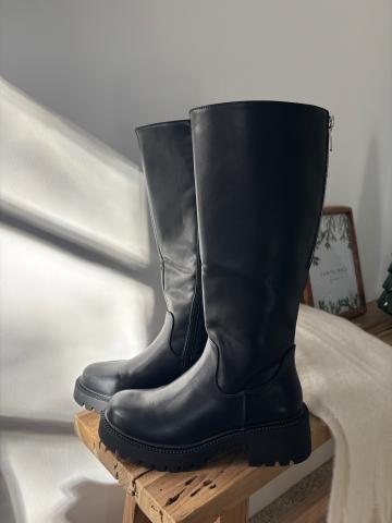 Bottes noires Matière synthétique Fermeture éclair sur côté et à l'arrière Tailles : du 36 au 41 Prendre sa taille habituelle Longueur totale ( avec talon ) : 41cm Hauteur du talon : 5cm
