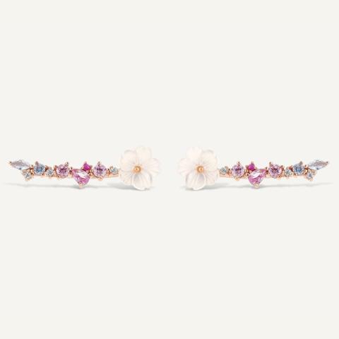 Des boucles d'oreilles grimpantes pour femme. Ces boucles d'oreilles climbers sont confectionnées à la main, en argent massif 925 et dorées à l'or fin 18k d'une épaisseur d'un micron. Couleur or rose. Bijoux or rose. La fleur est en nacre et sertie d'une perle naturelle de rivière. Nous proposons des climbers de haute qualité et originaux. Soyez fière et féminine avec nos bijoux. Des boucles d'oreilles grimpantes or rose. Boucles d'oreilles en or rose. Nébuleuse paris, yay paris, emma et chloé, lou yetu, histoire d'or, les joyaux daure avis