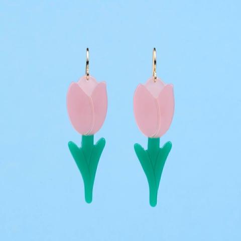 Boucles d'oreilles Coucou Suzette à crochet doré ornées de jolies tulipes rose et verte rétro en acétate. Ultra légère et confortable.