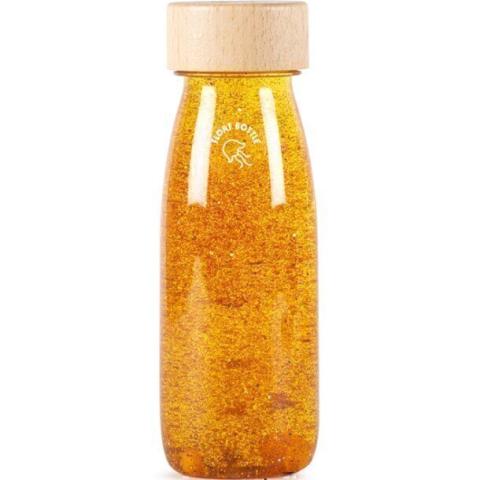 Bouteille sensorielle Float Curcuma de la marque Petit Boum. Un jouet d’éveil inspiré de la pédagogie Montessori, qui stimule les sens des bébés dès 3 mois.