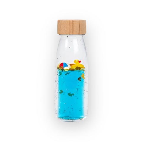 Maman canard fait un plongeon et joue avec son ballon de plage. Pouvez-vous voir ses canetons plonger sous l'eau ? À quoi cela ressemblerait d'enfermer un rêve dans une bouteille ? Bébé va adorer ce liquide à effet flottant. Chaque fois que la bouteille est secouée… le voyage commence ! Canards et ballons commencent à