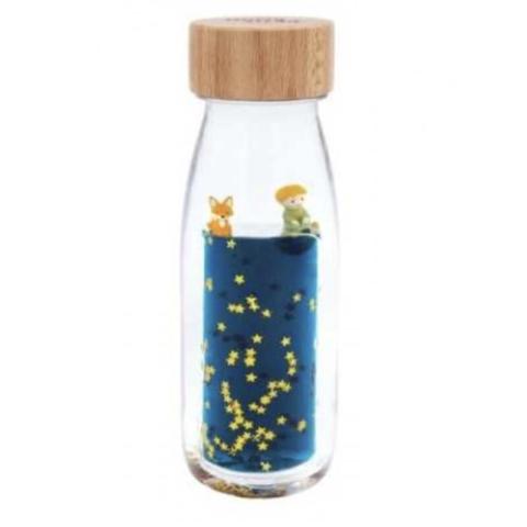 Découvrez la bouteille sensorielle Move Le Petit Prince de Petit Boum, une bouteille flottante révolutionnaire avec une double paroi offrant un effet loupe, idéal pour observer des étoiles.