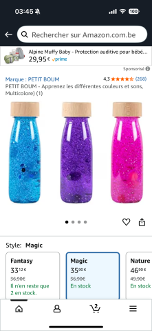 Ce produit est extrait d'une liste de cadeaux (Anniversaire, Noël, ...) déposée sur Kadolog. Kadolog permet de créer des listes de cadeaux (Anniversaire, Noël, ...) en toute liberté. Il est possible d'ajouter toutes vos envies cadeaux et de recevoir les dons directement sur votre compte. Avec les dons reçus, vous êtes alors libre d'aller acheter vos produits (comme ce 'Bouteilles sensorielles ') où et quand vous le souhaitez.