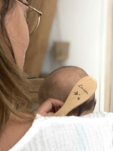 brosse en bois bébé joliement personnalisé avec la gravure du prénom de bébé ainsi que sa date de naissance, un cadeau souvenir original.