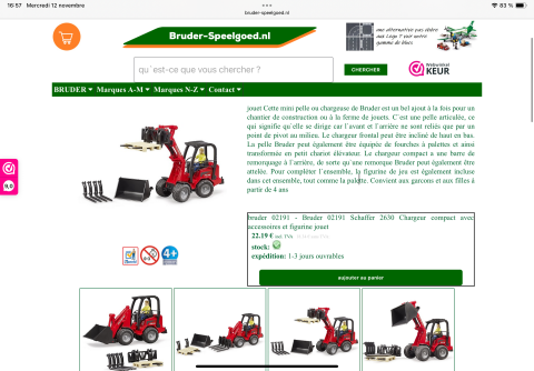 Ce produit est extrait d'une liste de cadeaux (Anniversaire, Noël, ...) déposée sur Kadolog. Kadolog permet de créer des listes de cadeaux (Anniversaire, Noël, ...) en toute liberté. Il est possible d'ajouter toutes vos envies cadeaux et de recevoir les dons directement sur votre compte. Avec les dons reçus, vous êtes alors libre d'aller acheter vos produits (comme ce 'Bruder 02191 Schaffer 2630 Chargeur compaa ') où et quand vous le souhaitez.