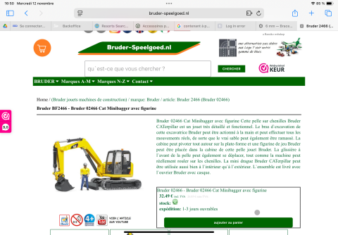 Bruder 2466 (Bruder 02466) € 32.49 || Bruder 02466 Cat Minibagger avec figurine. Cette pelle sur chenilles Bruder CATerpillar est un jouet très détaillé et fonctionnel. Le bras d`excavation de cette excavatrice Bruder peut être actionné à la main et peut effectuer tous les mouvements réels, de sorte que le vrai sable peut également être ramassé. La cabine peut pivoter tout autour sur la plate-forme et une figurine de jeu Bruder peut être placée dans la cabine de cette pelle jouet Bruder. La glissière à l`avant de la pelle peut également se déplacer, tout comme la machine peut réellement rouler sur les chenilles. La mini drague Bruder CATerpillar peut être utilisée aussi bien à l`intérieur qu`à l`extérieur. L`ensemble est livré avec l`ouvrier Bruder avec casque. (Bruder 2466 (Bruder 02466))