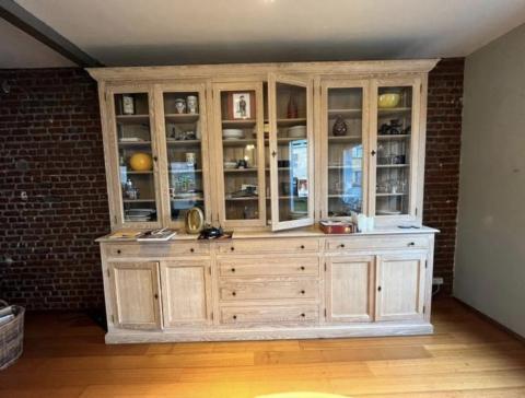 La partie basse comprend plusieurs portes et tiroirs, idéale pour le rangement du linge de table ou des ustensiles.
