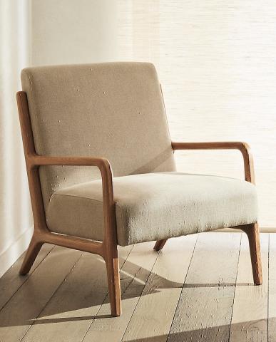 Butaca con estructura con patas y reposabrazos de madera de fresno y relleno con fundas de lino.
