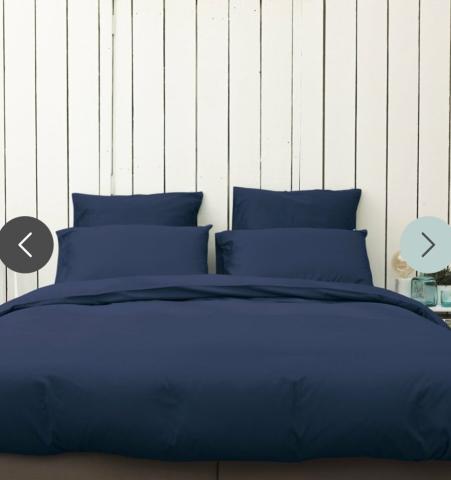 Une idée de cadeau commun pour Franck et pour moi, parce que l'idée c'est d'en profiter ensemble : une parure de lit Kalani bleu marine en satin de coton.