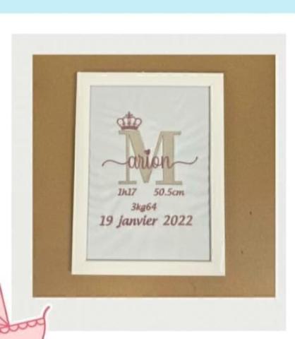 Un cadre souvenir avec le prénom, la date de naissance, le poid, la taille brodé sur tissu.