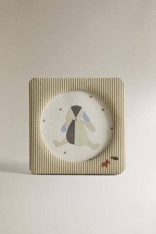 Cadre photo enfant de format carré, doublé en tissu à rayures, avec un détail brodé dans un angle. Pour des photos de 10,5 x 10,5 cm.