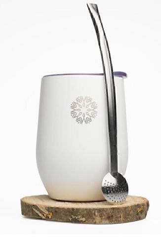 Une calebasse thermos blanche facilement transportable. Avec sa bombilla filtrante (couleur argent). Les deux en acier inoxydable.