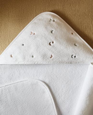 Capa de banho de bebé em branco com capuz em algodão cardado com bordados de luas e estrelas.