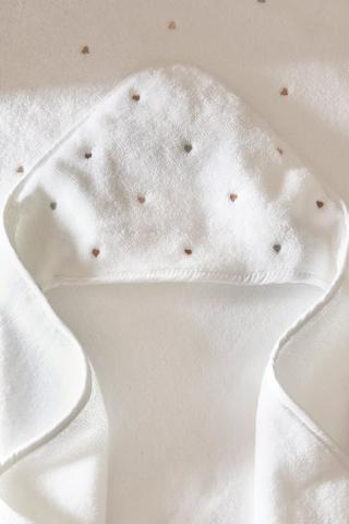 Cape de bain pour enfant en coton éponge ornée de cœurs brodés.