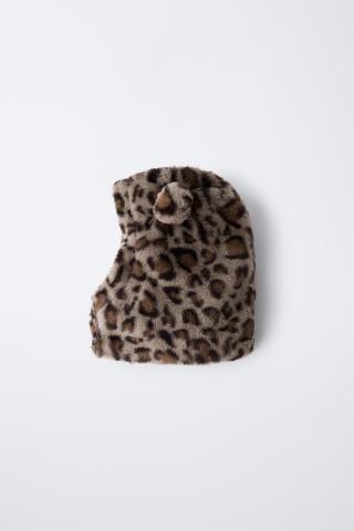 Capuche en fausse fourrure avec décor petites oreilles et fermeture boutonnée sur le devant. Imprimé animal print.