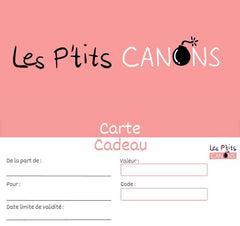 Ce produit est extrait d'une liste de naissance déposée sur Kadolog. Kadolog permet de créer des listes de naissance en toute liberté. Il est possible d'ajouter toutes vos envies cadeaux et de recevoir les dons directement sur votre compte. Avec les dons reçus, vous êtes alors libre d'aller acheter vos produits (comme ce 'Carte cadeau - Les P'tits Canons ') où et quand vous le souhaitez.