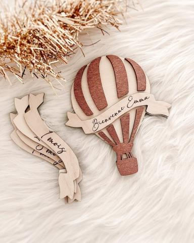 Pancarte en forme de montgolfière avec âge de votre bébé interchangeable. Fournis avec :13 cartes avec l’âge de 1 mois à 1 an et une carte de bienvenue Dimensions : environ 15cm Tout les articles personnalisables ne sont ni échangeables ni remboursables.