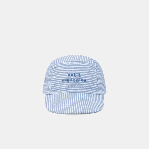 Idéale pour les enfants en été. En coton avec patte élastiquée, elle est confortable. Les rayures et la broderie rappellent l’univers marin. Fines rayures bleues pastels et écrues Broderie bleue "petit capitaine" sur l'avant Patte de serrage élastiquée à l'arrière Ce produit appartient à la Collection Croisière en Mer.