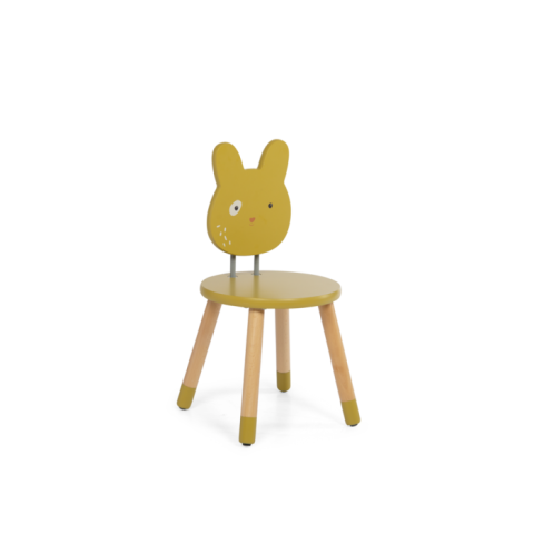 Chaise ocre en bois peinte, avec pour dossier, l'un des trois petits lapins ! I