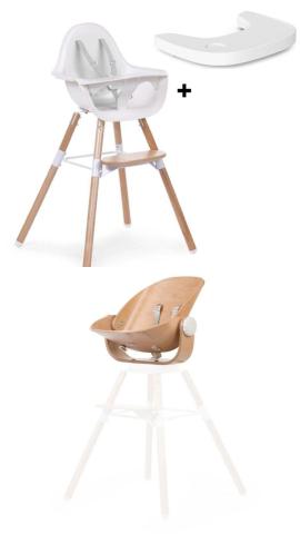 Lot comprenant la chaise haute avec sa tablette, le transat et 3 coussins.