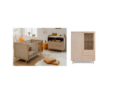 Le luxueux meuble Bali de Finori a un aspect chaleureux et naturel. Le meuble repose sur des pieds minces et inclinés, qui lui confèrent un aspect aéré. La collection Bali de Finori a un motif chêne/roseau. L'armoire a 2 portes et 2 tiroirs spacieux. Derrière la grande porte du placard se trouvent plusieurs étagères. La petite porte du placard est équipée de verre et l'étagère est également en verre. Cet aspect vitrine donne au meuble un effet ludique. Agréable à décorer avec quelques objets personnels de votre enfant. Pensez par exemple au faire-part de naissance, à une peluche ou à une photo !