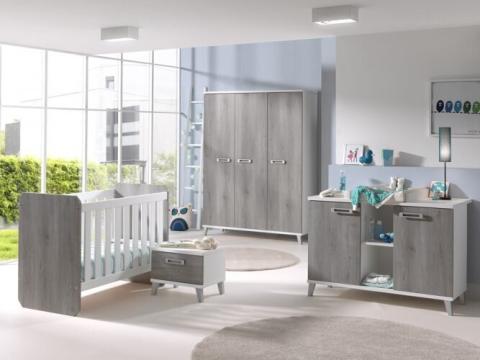 Chambre complète comprenant un lit évolutif, une garde-robe à trois portes, une table à langer transformable et une table de nuit. Achetée en seconde main.