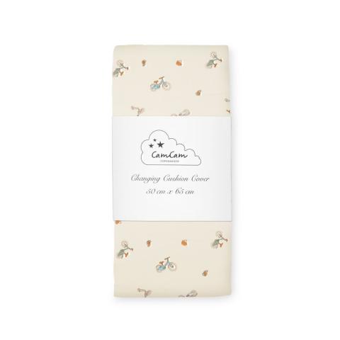 Practical extra cover for our changing cushions / changing pads. The cover has elastic casing and a coated surface to make it water and dirt repellent. Available in different Cam Cam prints. Changing Cushion Cover in green, brown, and blue shades on a cream white background.