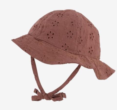 Chapeau doublé vieux rose pour enfant, réalisé avec une broderie fleurie. Le chapeau est muni de deux cordelettes pour l’attacher sous le cou. Grâce à son large bord, les yeux sont bien protégés du soleil.