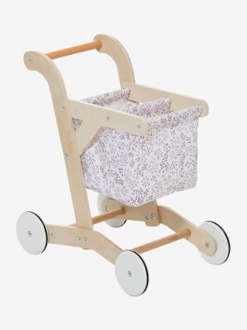 Un chariot de courses en bois doté d'un joli tissu fleuri pour faire son petit marché comme les grands ! Il possède 2 compartiments pour ranger les courses.