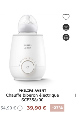Ce produit est extrait d'une liste de naissance déposée sur Kadolog. Kadolog permet de créer des listes de naissance en toute liberté. Il est possible d'ajouter toutes vos envies cadeaux et de recevoir les dons directement sur votre compte. Avec les dons reçus, vous êtes alors libre d'aller acheter vos produits (comme ce 'Chauffe biberon électrique SCF358/00 ') où et quand vous le souhaitez.