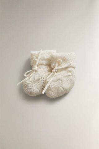 Chaussons bébé confectionnés en 100 % cachemire avec détail de dentelle ajourée et rubans à nouer.
