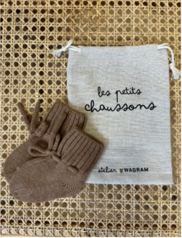 Paire de chaussons caramel en laine mérinos ultra douce de chez Atelier wagram fabriquée au Portugal. Ils sont faciles à enfiler et tiennent bien aux pieds grâce à leur petit cordon à nouer autour de la cheville. La laine mérinos est idéale pour réguler la chaleur et les chaussons peuvent donc être utilisés toute l'année. Convient aux bébés de 0 à 6 mois environ. Les chaussons sont fournis dans un pochon en lin.