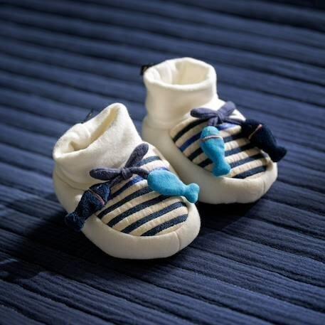 Chaussons marinière poissons - baby sailor blanc/bleu - Bébé aura toujours les pieds au chaud et pourra s'amuser avec les petits poissons en quise de pampilles! Les chaussons Baby Sailor s'associent parfaitement avec