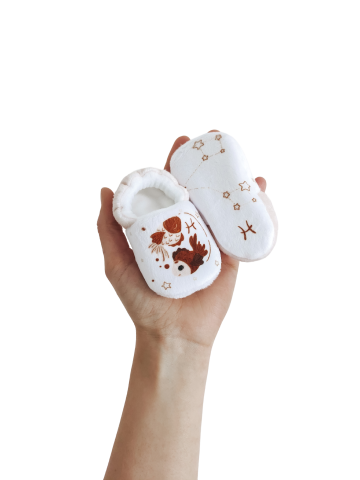 Collection Baby Astro - Poisson (20 février - 20 mars) DESCRIPTION Les Chaussons sont entièrement doublés d’une polaire douce pour le confort des pieds de bébé et doublés de mousse souple à l'intérieur. Fabriqués à la main en France, ils sont conçus pour les nouveau-nés et bébés qui apprennent à marcher, offrant souple