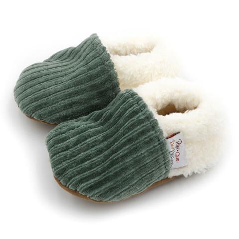 Les chaussons en velours taupe fabriqués en France à la main sont parfaits pour les premiers pas de bébé !