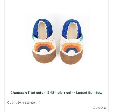 Ce produit est extrait d'une liste de naissance déposée sur Kadolog. Kadolog permet de créer des listes de naissance en toute liberté. Il est possible d'ajouter toutes vos envies cadeaux et de recevoir les dons directement sur votre compte. Avec les dons reçus, vous êtes alors libre d'aller acheter vos produits (comme ce 'Chaussons titot ') où et quand vous le souhaitez.