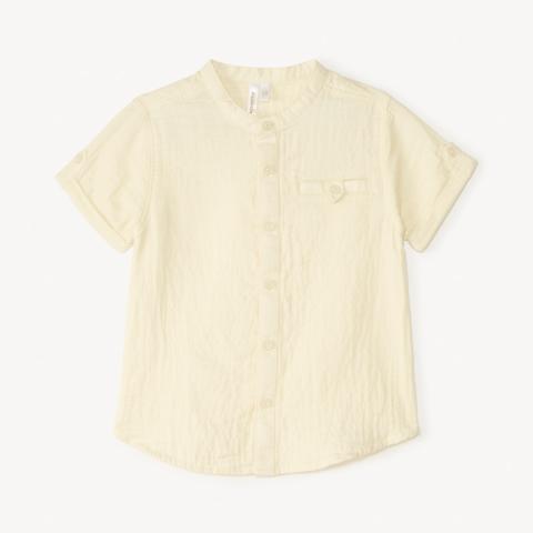 Chemise à manches courtes en gaze de coton. Coloris uni écru. Col mao. Ouverture boutonnée sur l'avant. Poche plaquée côté cœur avec fermeture boutonnée en forme de triangle. Dos uni.