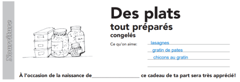 en toute liberté. Il est possible d'ajouter toutes vos envies cadeaux et de recevoir les dons directement sur votre compte. Avec les dons reçus, vous êtes alors libre d'aller acheter vos produits (comme ce 'cheque repas congelé