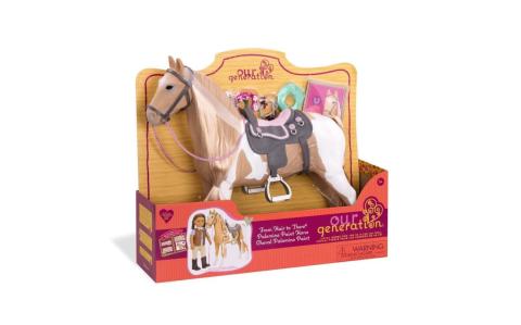 Jeux créatifs avec Our Generation Tamera : cheval beige/blanc de 51 cm avec accessoires inclus. Idéal dès 3 ans. Commandez maintenant chez DreamLand.