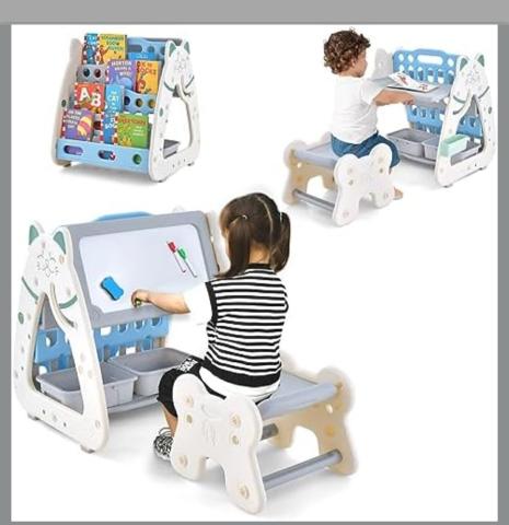 3 en 1 Chevalet Enfant Magnétique avec Tabouret Réglable, Bibliothèque avec Tableau Effaçable & 2 Boîtes, Bureau en Forme de Chat, 56 x 54 x 71 cm, 1-5 Ans