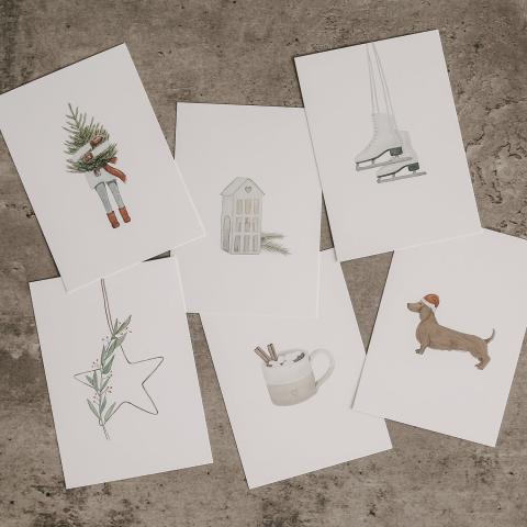 Découvrez notre ensemble de cartes magique Christmas time avec 6 cartes aquarelles dessinées à  la main. Parfait pour des vœux de Noël élégants et des invitations.