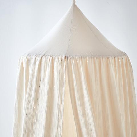 Ciel de lit en coton gaufré, doux et élégant. Il décore la chambre et crée un cocon cosy autour d'un lit ou d'un berceau. Il peut également former un coin détente, façon cabane, avec des coussins et un tapis douillet. Le ciel de lit s'accroche simplement au plafond avec un clou.