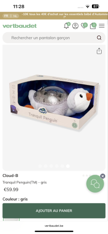 Ce produit est extrait d'une liste de naissance déposée sur Kadolog. Kadolog permet de créer des listes de naissance en toute liberté. Il est possible d'ajouter toutes vos envies cadeaux et de recevoir les dons directement sur votre compte. Avec les dons reçus, vous êtes alors libre d'aller acheter vos produits (comme ce 'Cloud b projecteur pingouin ') où et quand vous le souhaitez.