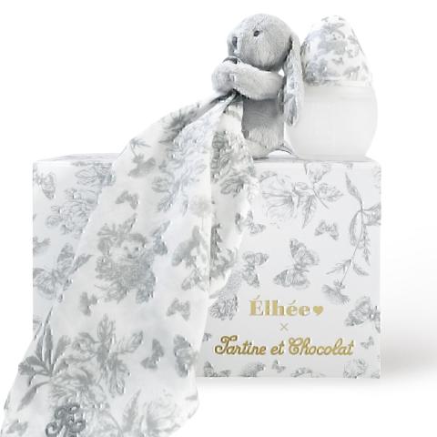 Coffret élégant composé d'un biberon 150 ml et d'un doudou, tous deux sublimés par le délicat motif Toile de Jouy, emblématique de la Maison Tartine et Chocolat.