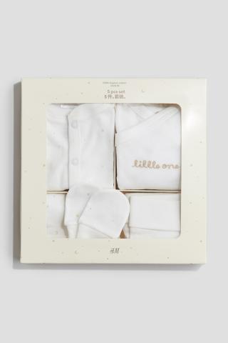 Coffret-cadeau en jersey de coton doux, composé d'une combinaison, d'un body et d'un pantalon accompagnés d'un d'un bonnet et d'une paire de moufles anti-griffures. Combinaison à manches longues avec encolure ronde et fermeture par boutons-pression devant et le long des jambes pour faciliter le change. Body à manches longues avec petite broderie en haut et fermeture croisée devant, maintenue par boutons-pression sur les côtés et à l'entrejambe pour faciliter le change. Coutures froncées autour des jambes pour plus de confort et un meilleur ajustement au niveau de la couche. Pantalon avec large ceinture repliable à la taille. Bonnet noué en haut. Moufles anti-griffures avec poignets côtelés.