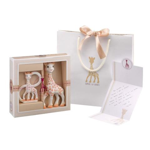 Ce coffret cadeau est composé du célèbre hochet Sophie la Girafe ainsi que d'un anneau de dentition en caoutchouc 100% naturel.