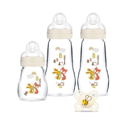 Ce coffret comprend : un biberon en verre 170 ml, 2 biberons en verre de 260 ml et 1 sucette anatomique. Les biberons sont accompagnés de 2 tétines débit 1 et de 2 tétines débit 2.