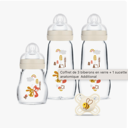 Un coffret MAM pour boire le lait de maman avec papa ou à la crèche. Ce lot contient trois biberons en verre (170 ml et 260 ml), 4 tétines ainsi qu'une sucette anatomique.