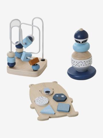 Offrez à votre enfant un adorable set de 3 jeux en bois, grâce auquel il pourra stimuler ses sens et faire de très chouettes découvertes ! Ce coffret se compose d'un mini boulier, d'un ours des form