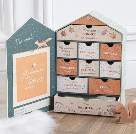 Ce joli coffret de naissance en forme de maison contient plusieurs compartiments à souvenirs pour que vous puissiez y glisser plusieurs petits cadeaux